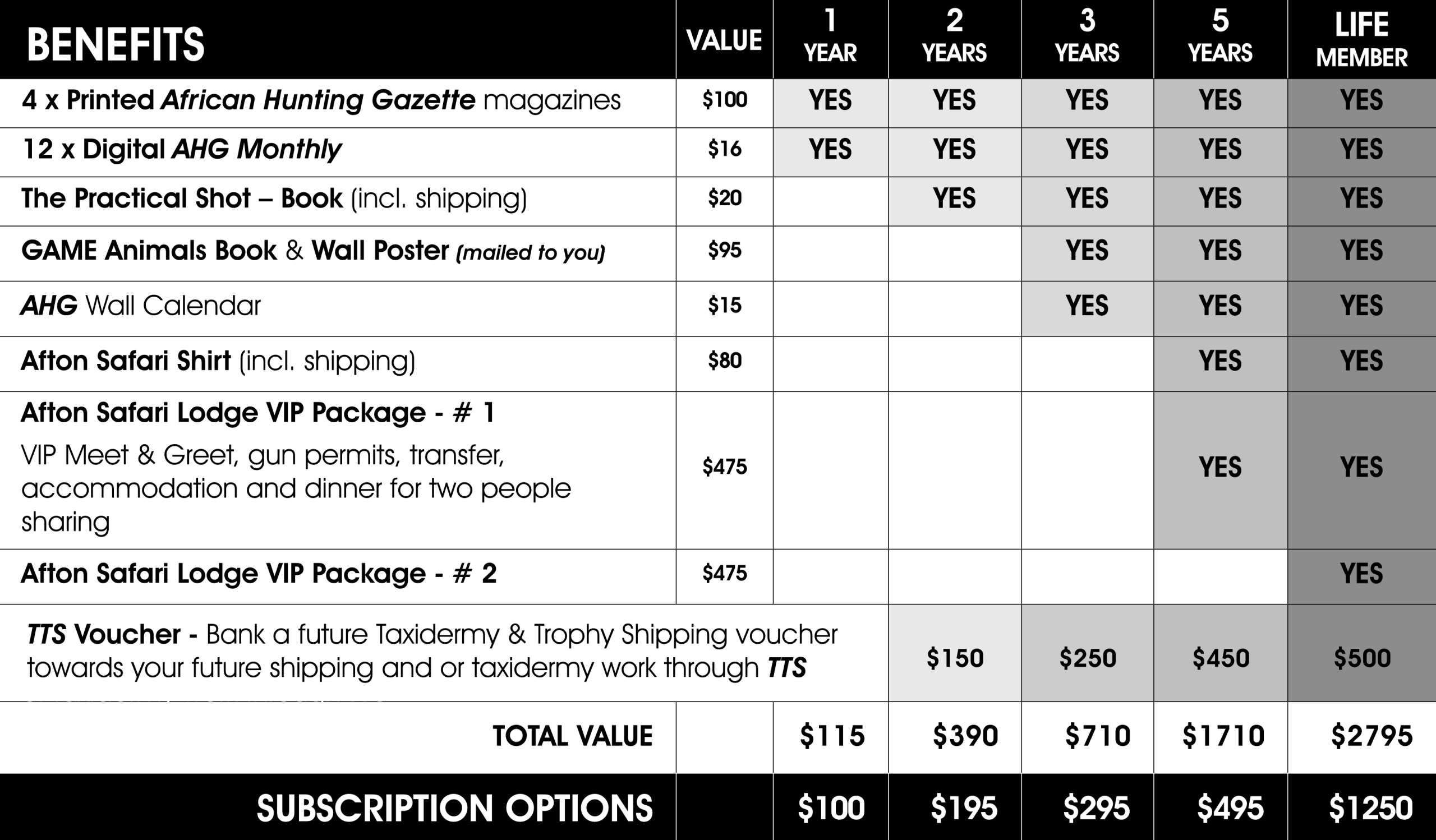 Sign up as a subscriber (1, 2, 3 or 5 years, or as a Life Member) and be included in this all-inclusive Big Buffalo Safari. And remember, all existing subscribers are automatically in the DRAW. Life Membership sign-up includes entry into the December 12 draw for the RIGBY .416.