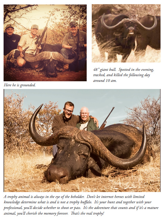 I do not bother to answer; I have heard that retirement speech before. We find the buffalo, shoot a good bull, and the next day Peter’s hips are fine again.