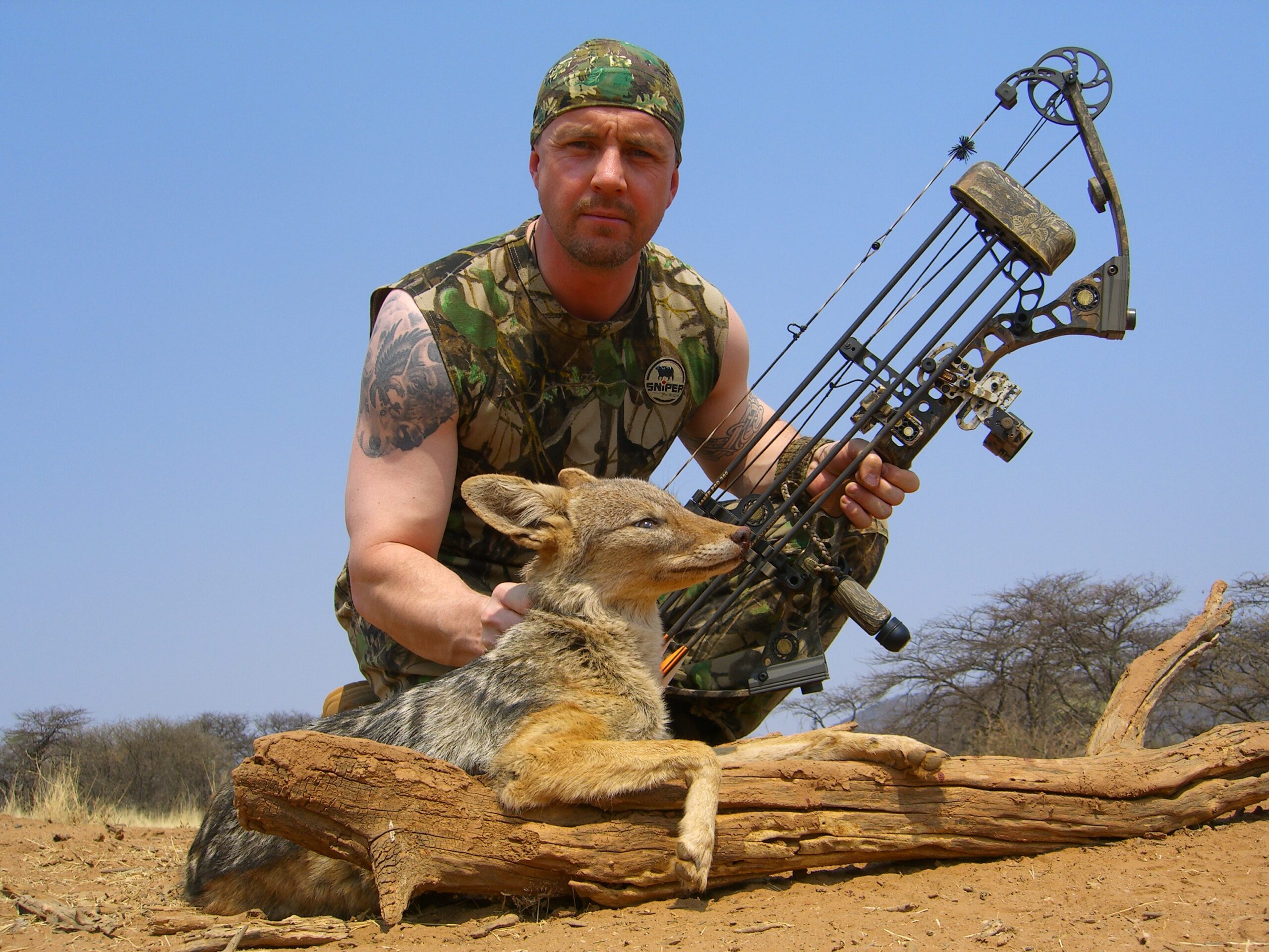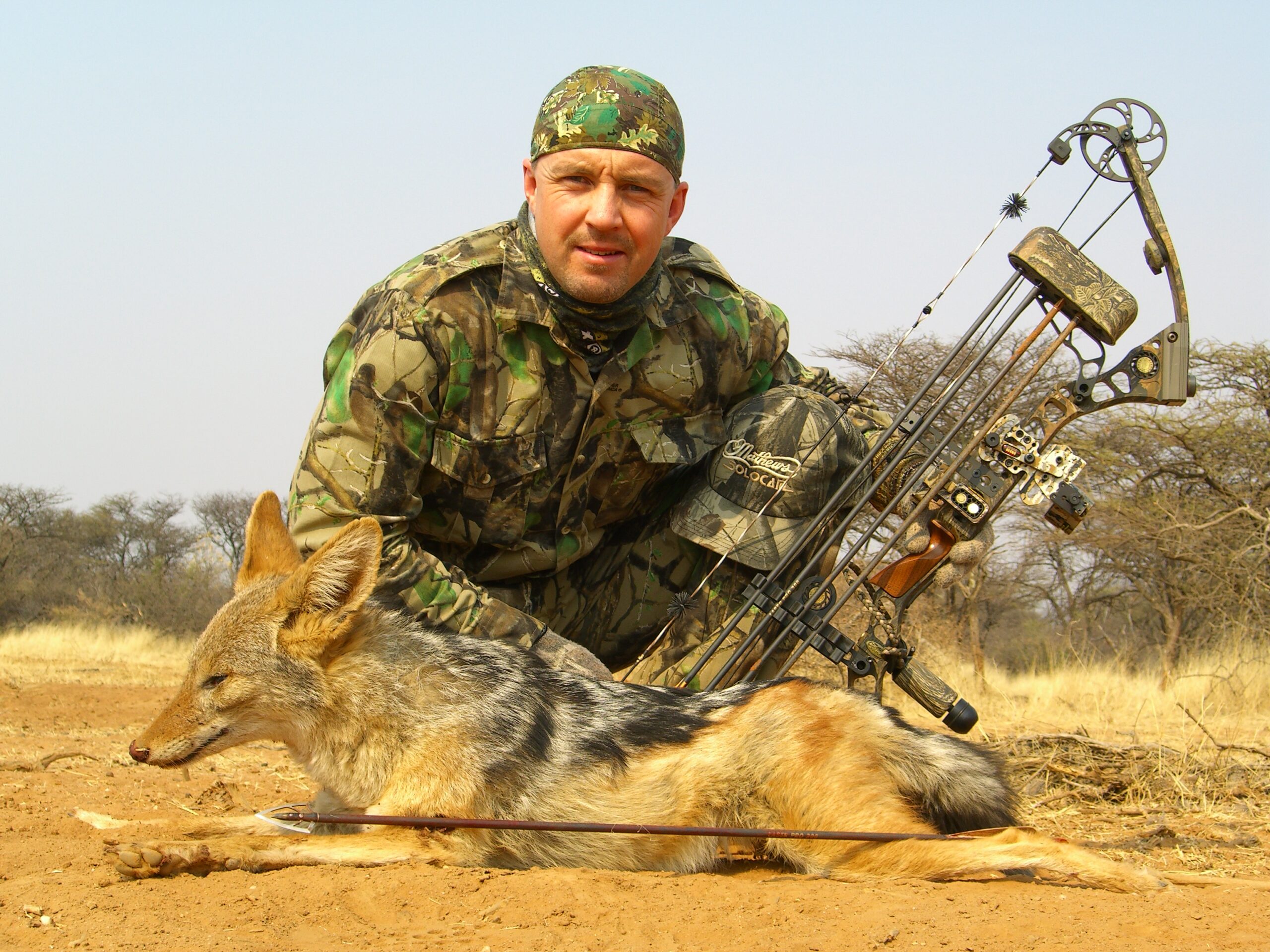 This is my one and only chance to put the sight on the vitals of the big male in front. Fortunately, the younger is not standing behind or in front of him and the line of fire is clear when I release the arrow for its deadly mission. The arrow, with the Silverflame 125 grain broadhead, penetrates completely the body of the animal over the left front leg and the jackal jumps up immediately. In three, four, five wild turns, he tumbles around to the right before he expires within seconds, only 10 yards away from where I shot him. No long suffering. The young jackal is completely irritated about what happened and runs around his dead friend twice before he scampers into the bush. We wait a couple of minutes before I sneak out of the blind to pick up the jackal and look for the arrow, which we finally found 70 meters behind the shooting spot. What an experience and unexpected start of the day.