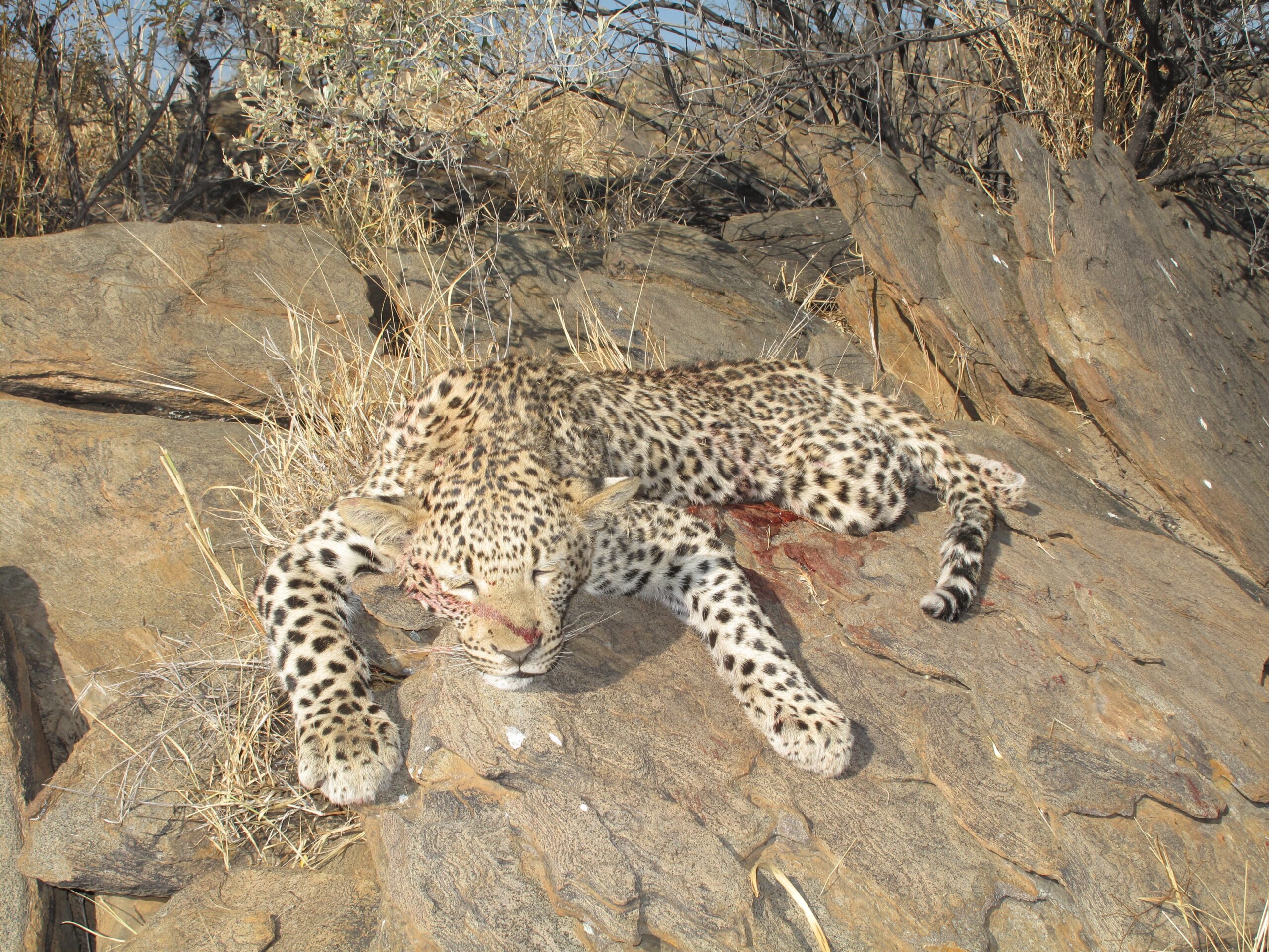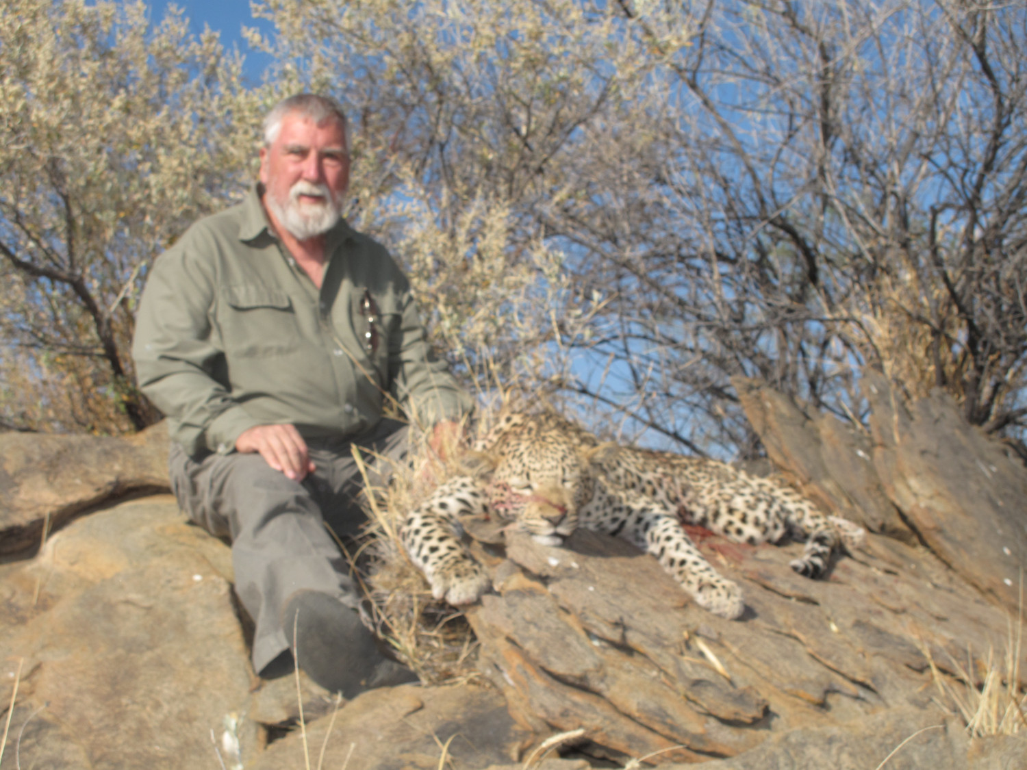 Dean and I went into the blind around four o’ clock. It was still sweltering from the heat of the day. Two hours till sundown. No talking, no loud swatting of bugs, anxiously watching the sun drop lower and lower. And no sign of a cat. I confess that my tolerance of frustration was tested. But then things came together. The cat showed up while I could still get a decent sight picture and identify the cross hairs against its body. I squeezed the trigger, was blinded by the muzzle flash, and the next thing I knew was Dean slapping me on the back and saying (much more calmly than I felt) “Good shot, Peter”. We waited the proverbial cigarette time, and with our flash lights walked over to the bait site. There on the ground, lay my leopard. Dead.
