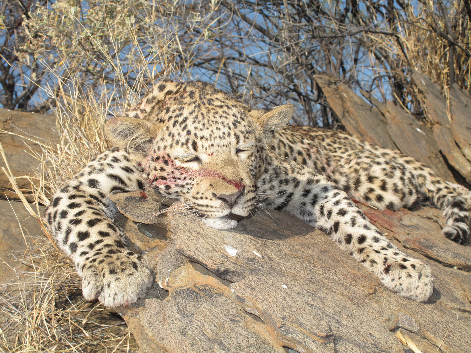On one occasion when we checked in the morning, the bait was gone and there were lion tracks. If lions move in, the leopards will decamp. On another occasion, the local game authorities had decreed that, killing a female would carry a US$ 20,000 fine – not a risk to run. We had not been able to reliably determine the cat’s sex, and gave up. Another disappointing situation involved a cat that apparently did not like the location of the bait and paid only short visits. So we un-wired the bait so that the cat could take it somewhere else it preferred. Sure enough, the next morning the bait was gone. We followed tracks and found that a pack of hyenas had ambushed our cat, which had wisely dropped its meal and treed up.