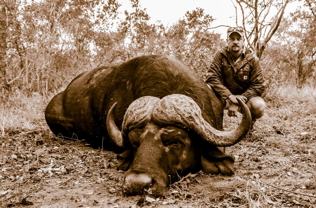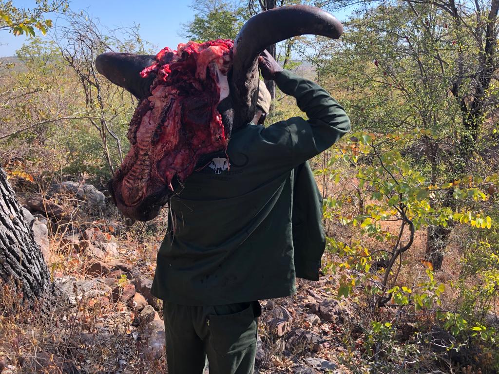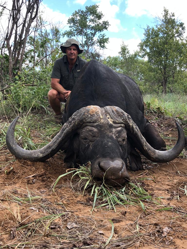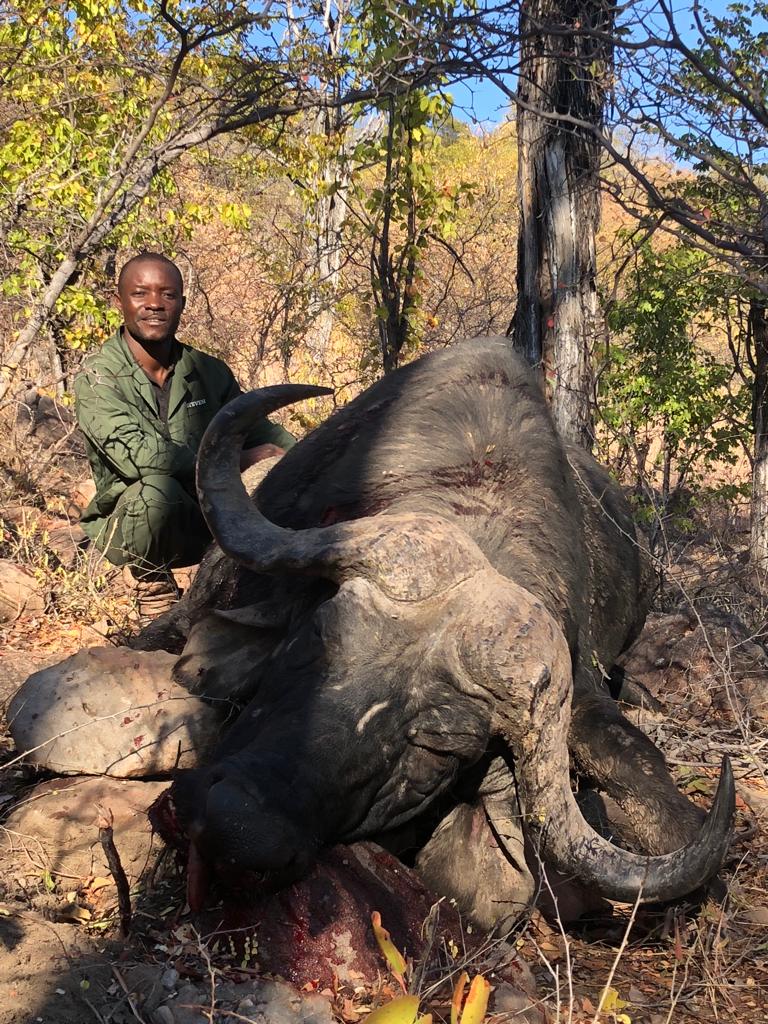 With a more than 40” spread and massive worn bosses, the tips were all but gone showing his age – a bull with character. He bore the scars from hyena and lion as well as from a poacher’s spear.