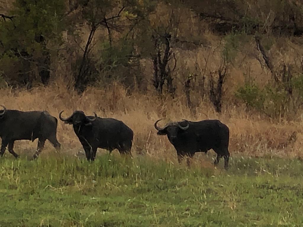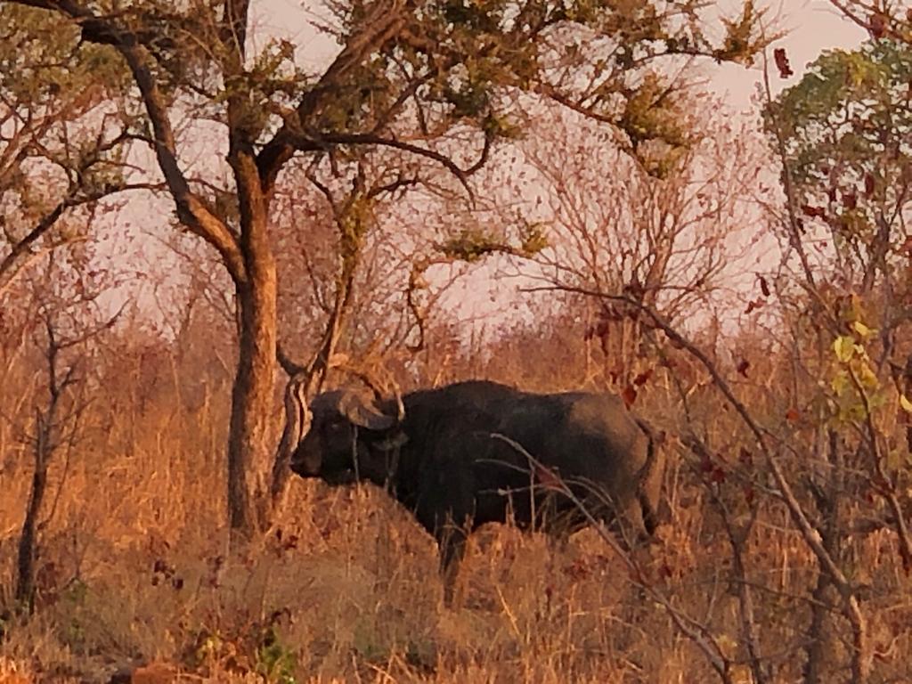 It was now 11.30 and we had been motionless for some time. To our left and down a steep embankment, was a major river, currently, wide, sandy and mostly dry. A few small pools had formed in some of the rocky portions and in areas where the water during the rainy season had cut away at the bank to form deep hollows. In some there were still had small fish in the oxygen-depleted muddy water, and were devoured by gathering maribou storks and fish eagles. To our right was an open patch of sparse woodland, dotted with outcrops of jagged black rock. About seven kilometers behind us was the vehicle. Ahead lay our quarry, two battle-worn buffalo, each armed with memories of previous encounters, cunning, and potentially deadly.