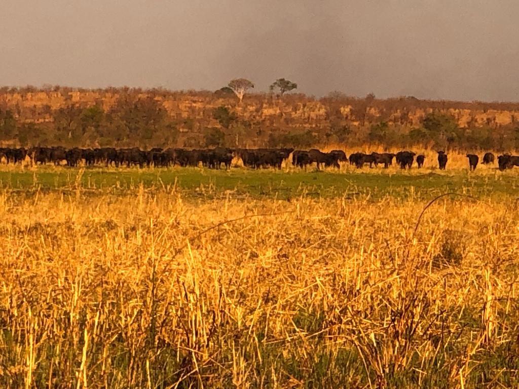 We stopped, crouched, and motioned for the rest to do the same. Both Steven and I had heard a sound – ox-peckers – a sure sign that we were close. We scanned the horizon and picked up a few buffalo ahead. They disappeared into the tree line about 300 meters in front. Game on! From this point forward, odds were slightly better as we potentially had a direction and idea of where they were. A short group discussion, and we carefully took positions and started the slow approach to where they could be resting. It was 10 a.m. and the sun was fierce, humidity was high and sweat drenched us. Steven’s back behind his water pack was soaking and my hand felt clammy against the comforting grip of my double.