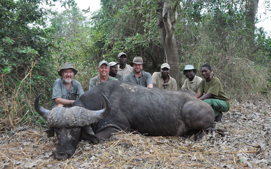 Much to my relief, we found blood in the first 20 yards, a sure sign the bull was badly injured and unable to keep up with the rest. The blood trail was heavy, and within 90 yards we found him down in the trees. A little insurance, and I too had my buffalo.