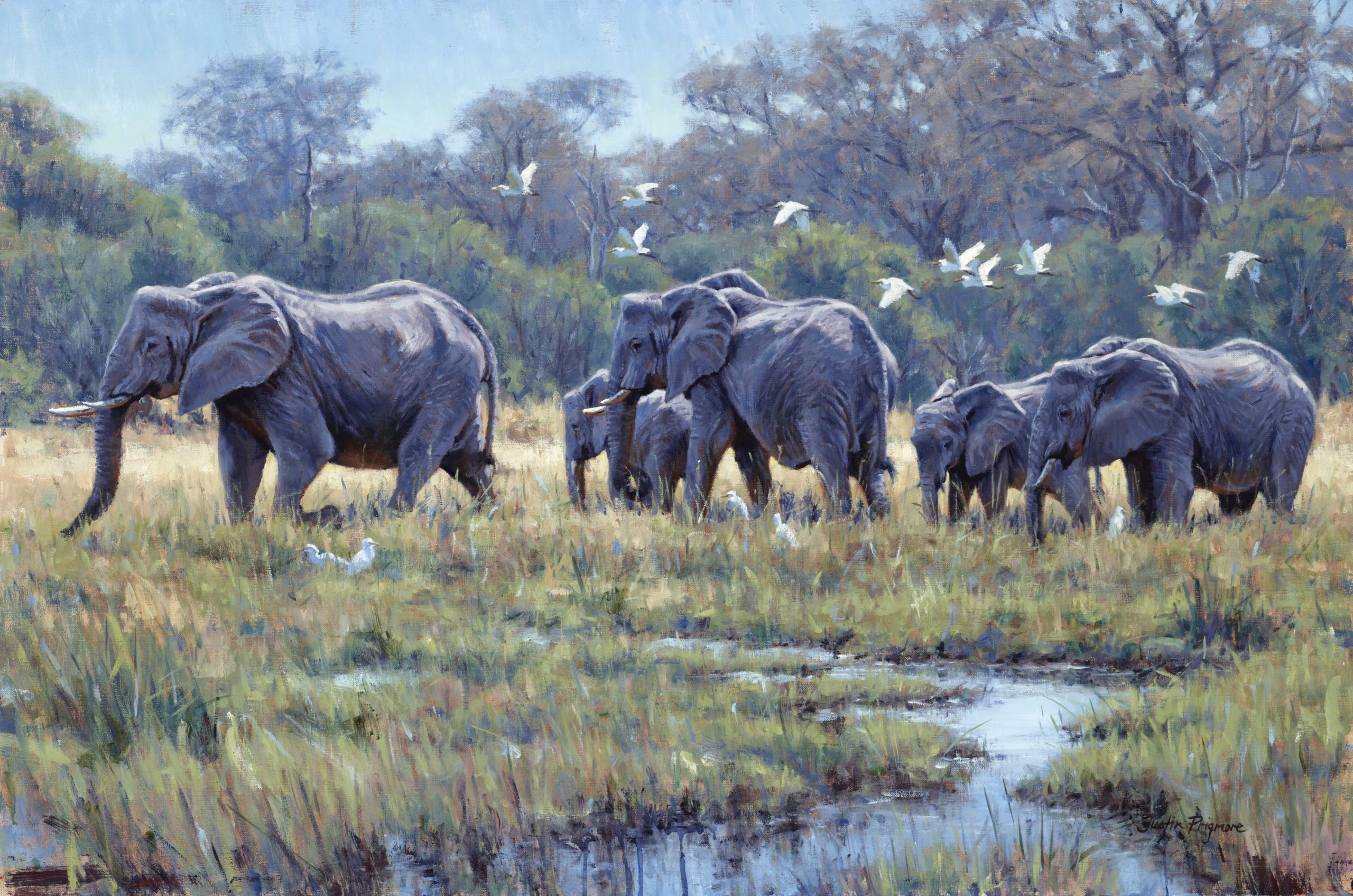 Another towering influence has been Robert Bateman. Through his books, the idea of an artistic life became not only attainable but thrilling. Bateman’s ability to weave together travel, wildlife, and art—moving seamlessly from a tiny wren to a monumental elephant—revealed a career that could be adventurous, purposeful, and deeply connected to the natural world. Today, Justin’s inspiration extends beyond any single genre. He is drawn to artists who can capture the essence and feeling of a subject without excessive detail, a quality he admires in deceased painters such as Kuhnert and Kuhn, and one he continues to strive for in his own work.